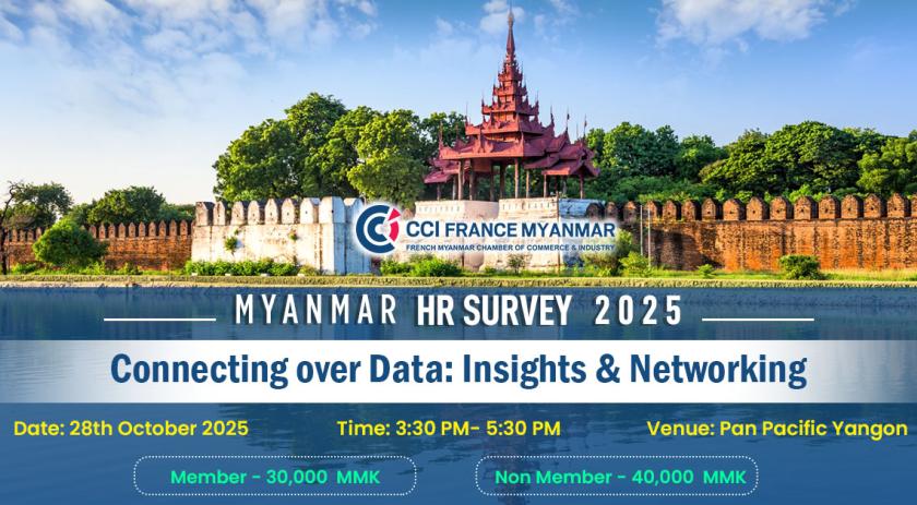 CCI France Myanmar is delighted to announce the availability of the Myanmar HR Survey 2025 report, and we will be conducting a launching event under, “Connecting over Data: Insight Sharing & Networking,” on 28th October 2025, at the Pan Pacific Yangon from 3:30 PM to 5:30 PM.