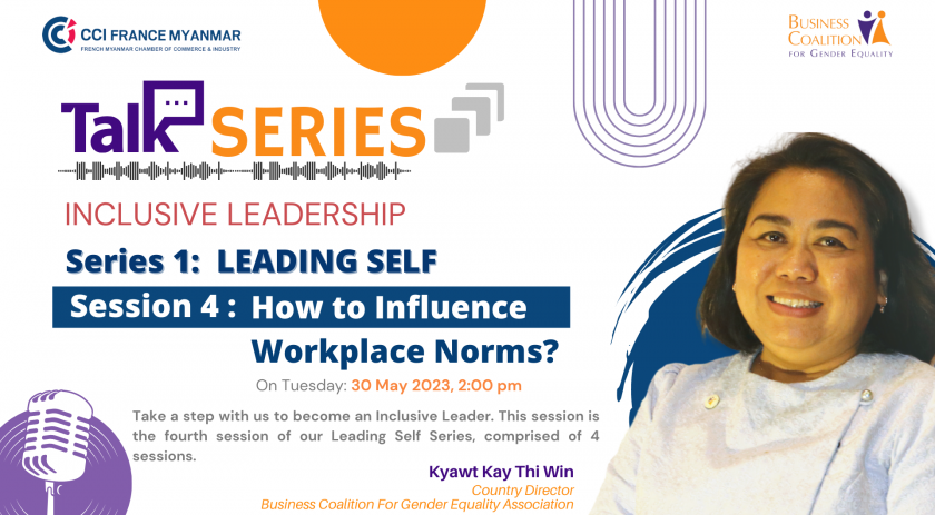 Are you looking to become an inclusive leader who can positively influence workplace norms? The Business Coalition for Gender Equality (BCGE) is hosting the fourth session of the Leading Self Series, titled How to Influence Workplace Norms?, under the six-session Inclusive Leadership Series on Tuesday, 30 May 2023, together with our partner organization, the CCI France Myanmar. In this series, we'll explore the importance of understanding workplace norms, the potential side effects of not addressing them, and the practical steps you can take to influence positive change. Don't miss out on this opportunity to enhance your leadership skills and create a workplace culture that values diversity and inclusivity.