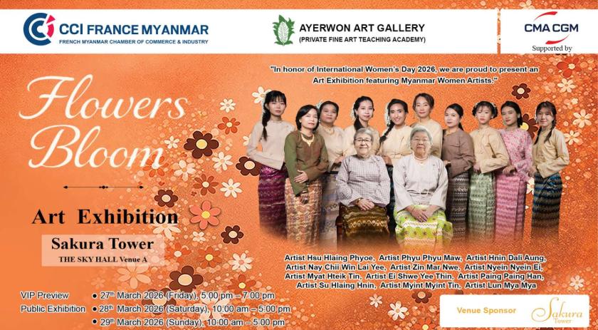In honor of International Women’s Day 2026,  you are warmly invited to celebrate creativity, strength, and artistic expression at “Flowers Bloom”, a special art exhibition highlighting the inspiring works of (12) Myanmar women artists, organized by CCI France Myanmar in collaboration with Ayerwon Art Gallery (Private Fine Art Teaching Academy) while supporting by CMA CGM(Myanmar) Co., Ltd .